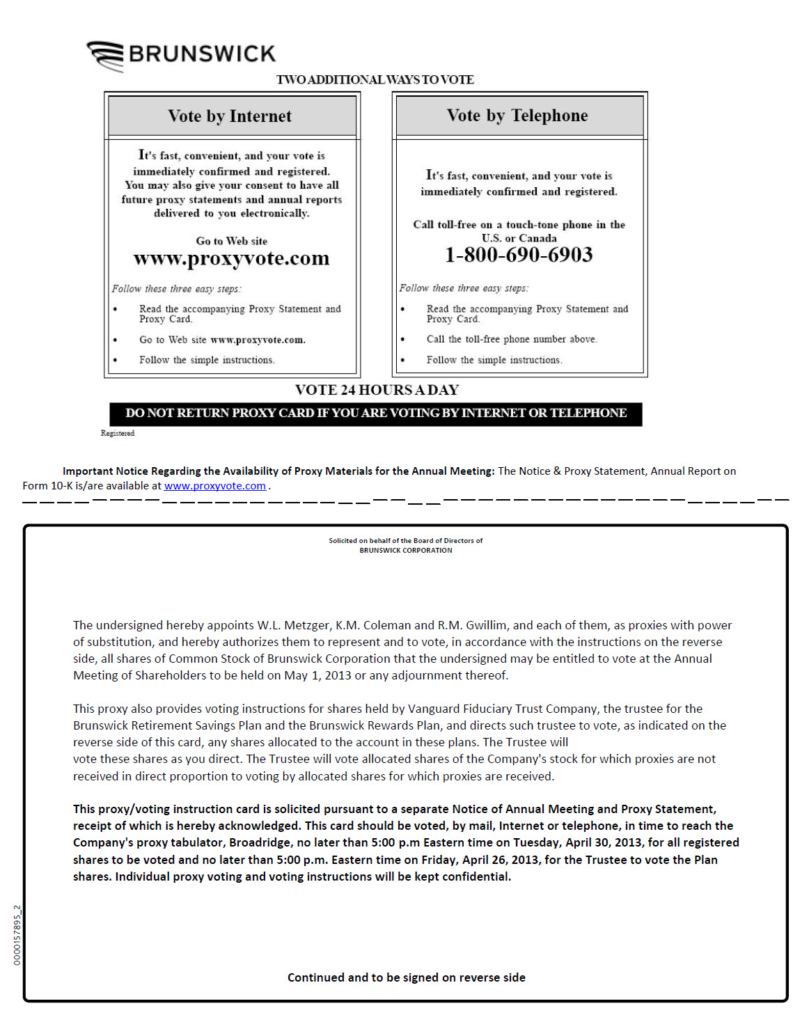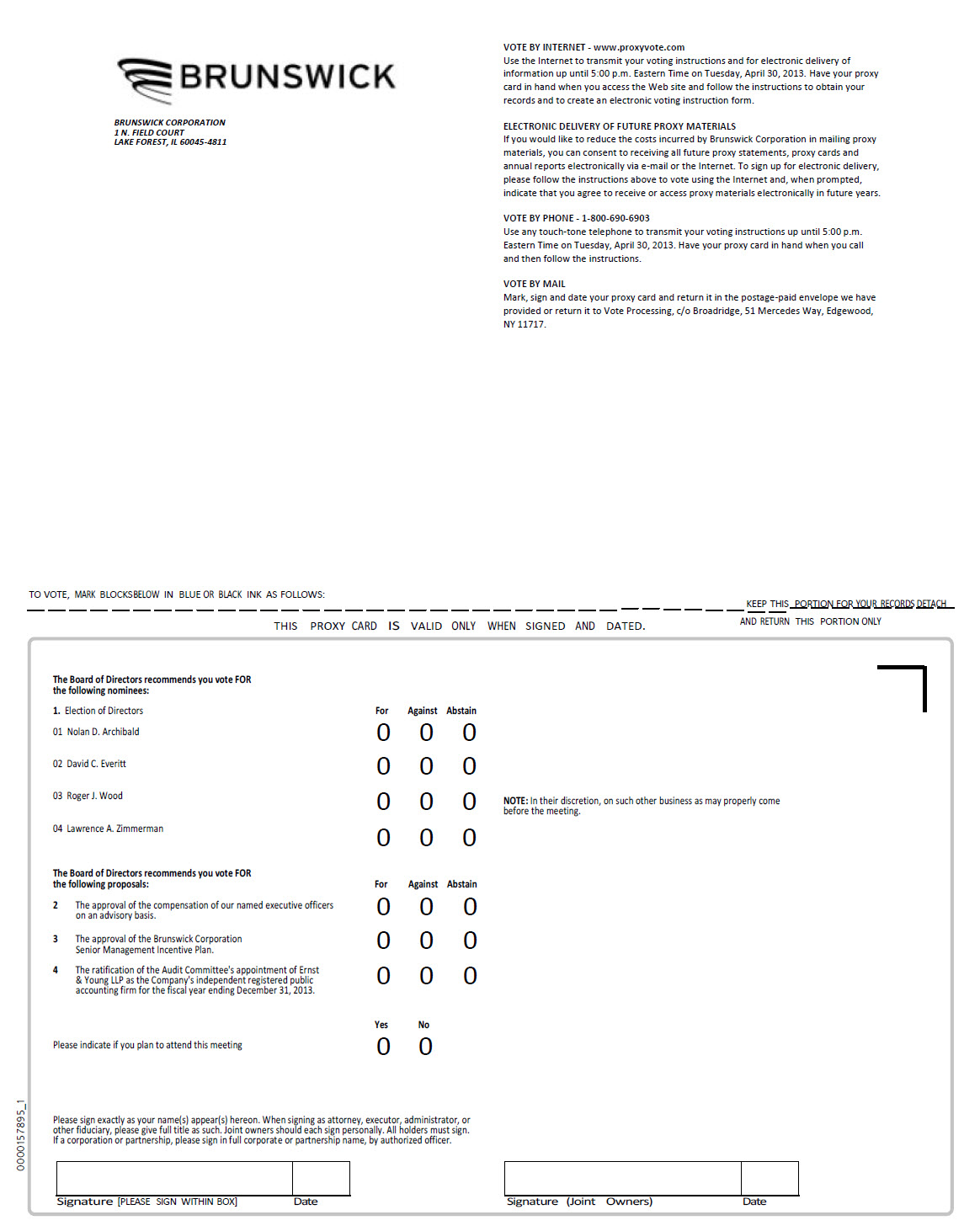 We are pleased to invite the shareholders of Brunswick Corporation to attend the Annual Meeting of Shareholders of Brunswick Corporation, to be held on Wednesday, May 1, 2013, at 9:00 a.m. CDT at Brunswick’s corporate offices, located at 1 N. Field Court, Lake Forest, Illinois.