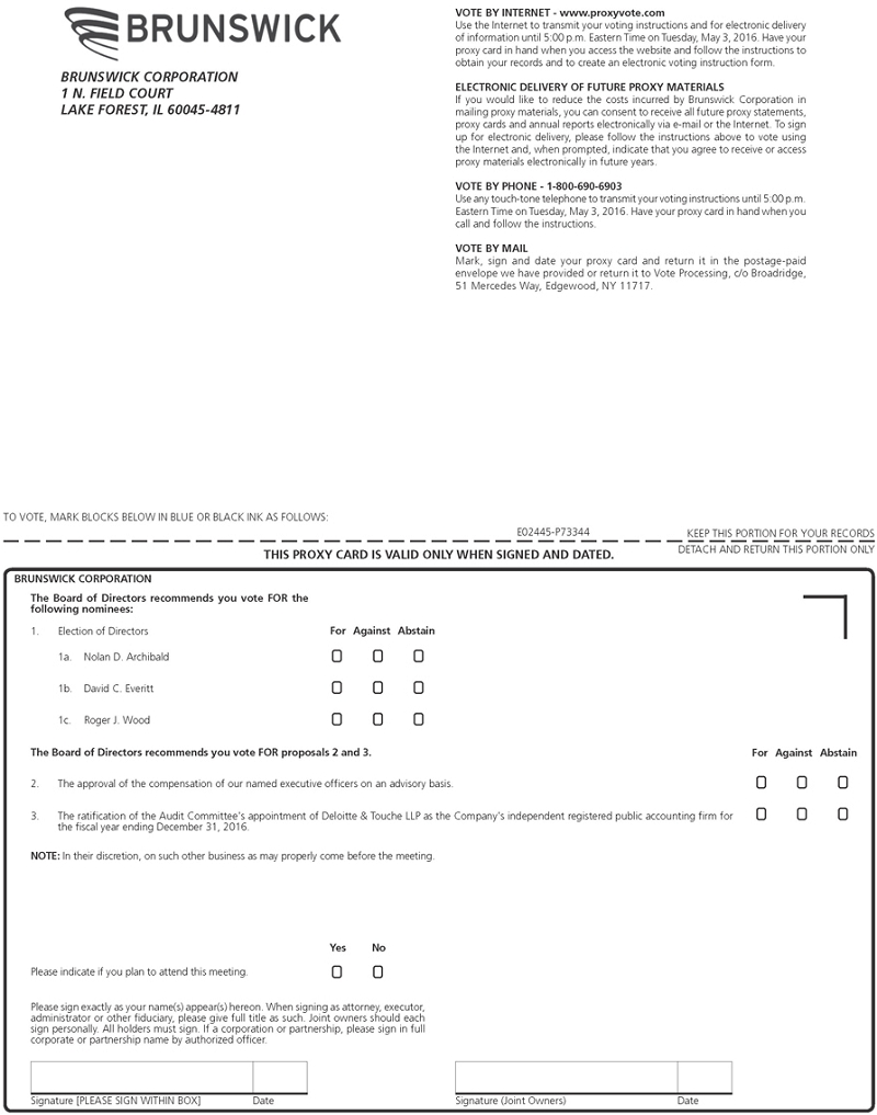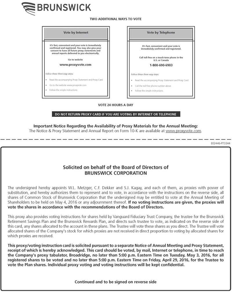 | • | If you hold shares in the Brunswick Retirement Savings Plan or the Brunswick Rewards Plan, you must direct the trustee of these plans how to vote these shares by one of the above methods not later than 5:00 p.m. EDT on April 29, 2016. |